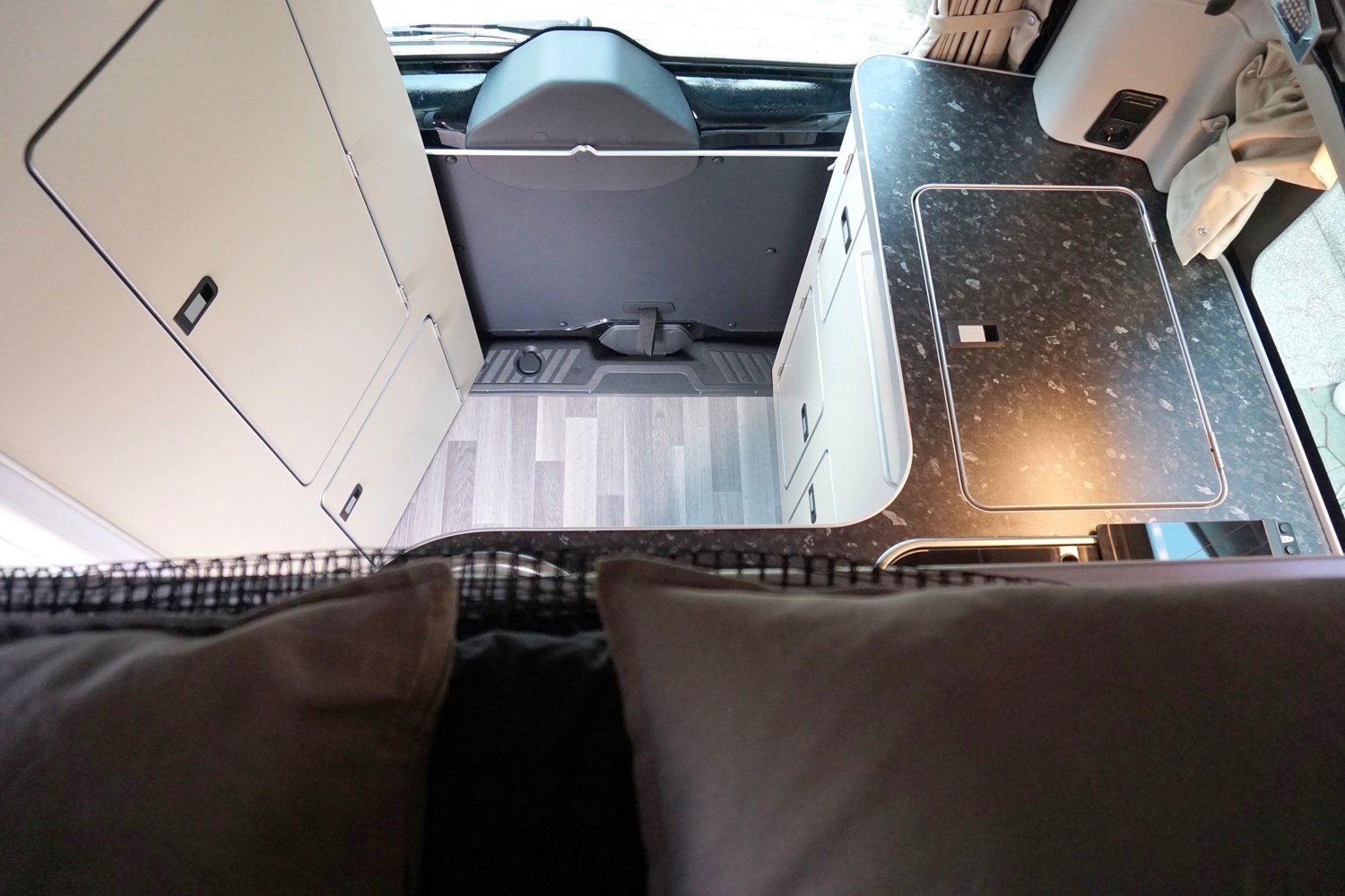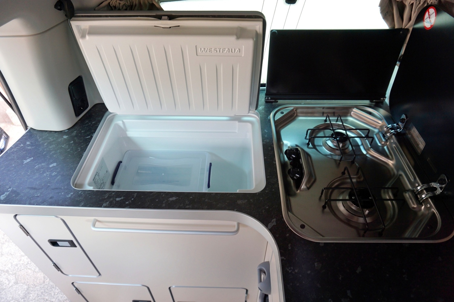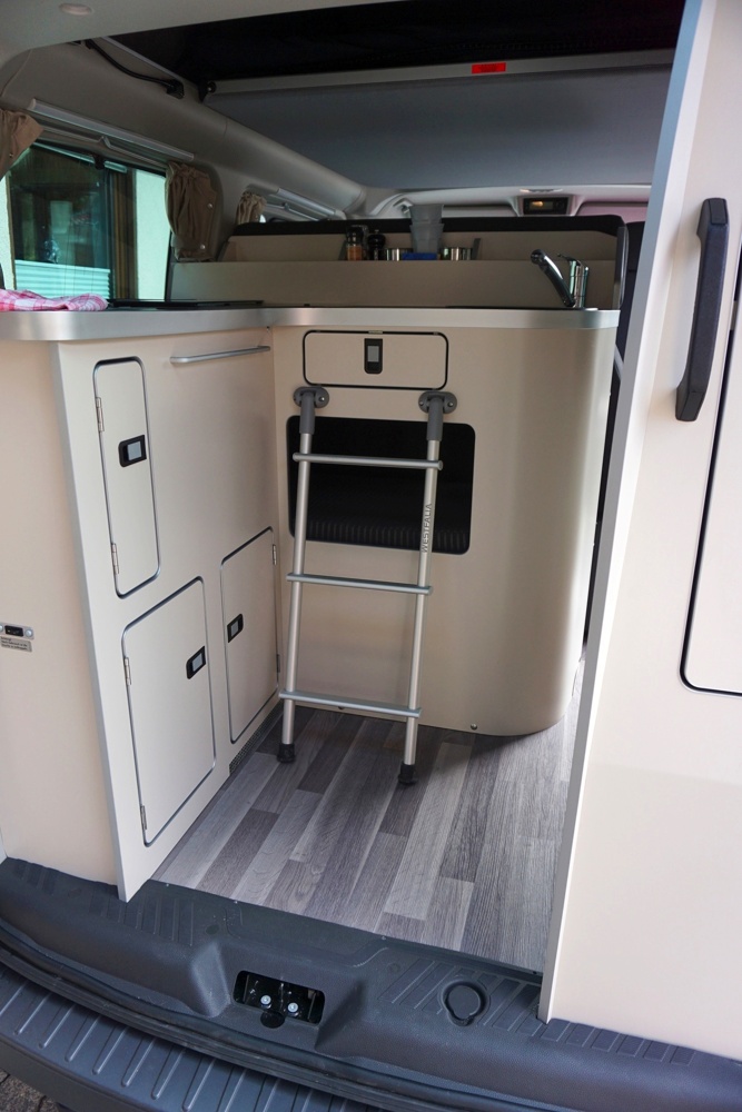 Die Mischung aus Auto & Wohnmobil ist auch das was den Ford Nugget auszeichnet. Es gibt eine "komplett" ausgestattete Küche im Bus. Wenn der Bus zu zweit genutzt wird, kann ohne großes Räumen im Aufstelldach übernachtet werden. Durch das schlichte schwarz ist er auf jeden Fall ein Hingucker auf jedem Campground.