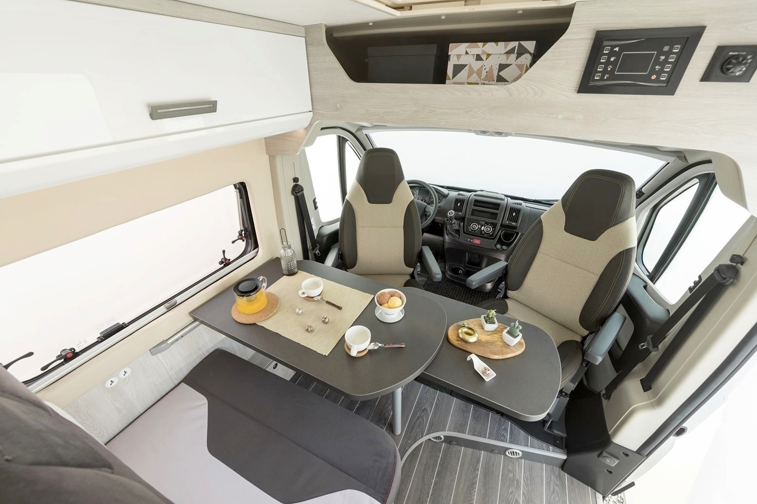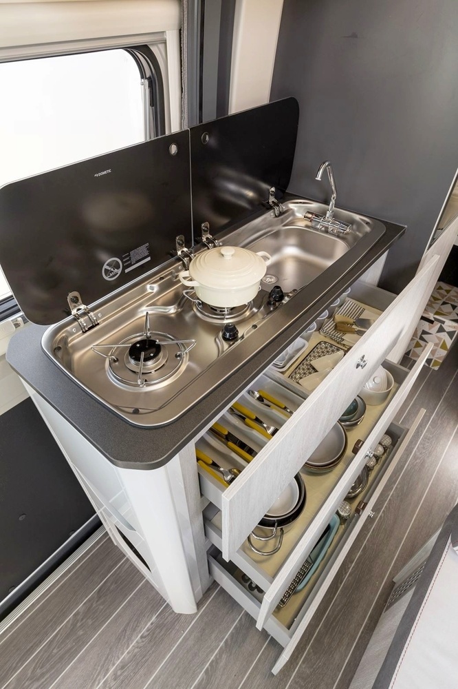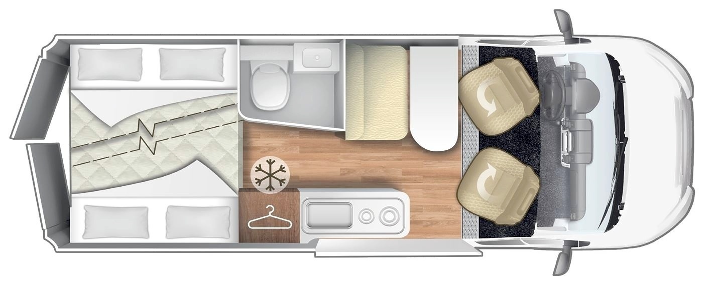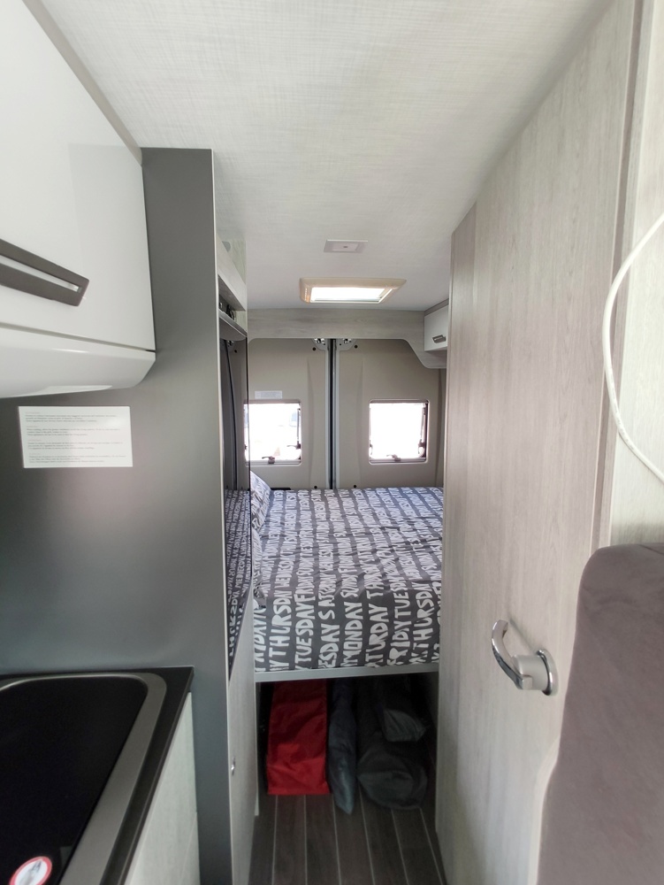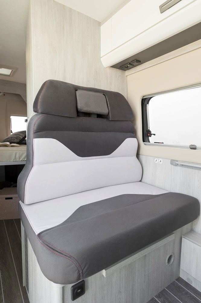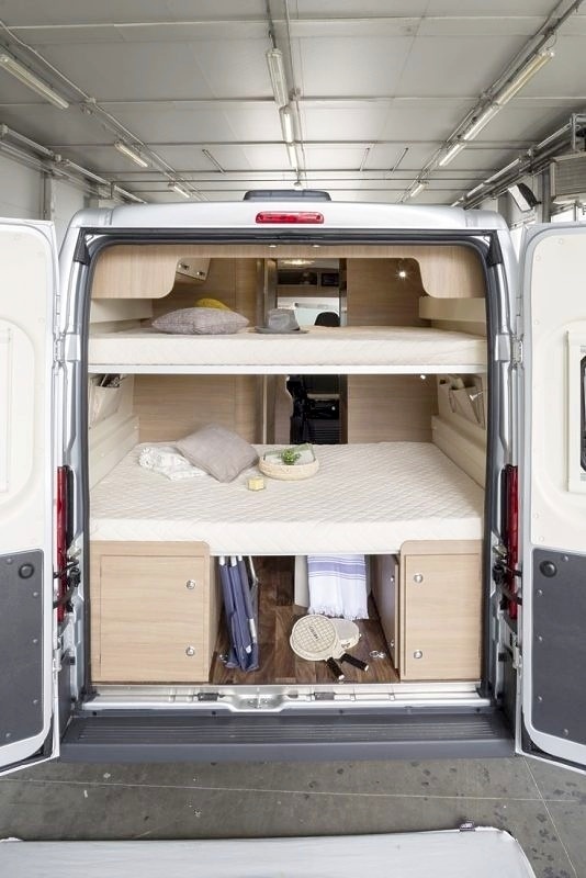Im hinteren Fahrzeugbereich angesiedelt entsteht eine Schlafgelegenheit ohne den Wohnraum einzuschränken.