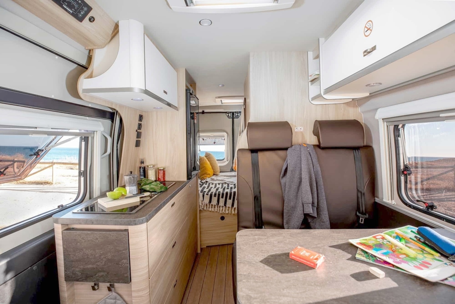 Das Modell verfügt über die komplette Ausstattung für ein unvergessliches Reiseerlebnis! Es beinhaltet ein Küchen-Set, einen Kühlschrank (80L), eine Küchenzeile mit Spüle, einen integrierten Gasherd, einen Esstisch im Innenraum und ein Reinigungsset. Du kannst auch dein Handy (oder andere Geräte) aufladen und deine Lieblingsmusik hören, denn das Modell verfügt über ein Radio mit AUX- und USB-Anschluss.